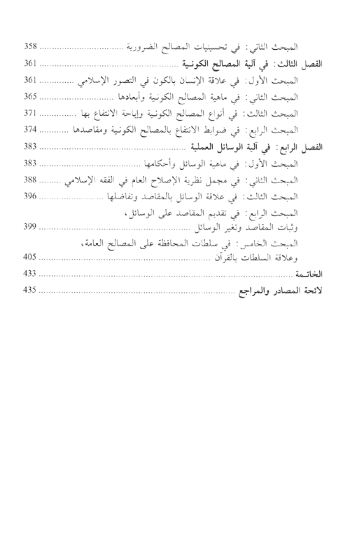 وأما الباب الرابع: فتطرق لآليات حفظ المصالحة العامة. وهو في أربعة فصول: وهي: الفصل الأول: في آلية المصالح الحاجية. وهو في مبحثين. وهما: المبحث الأول: في آلية المصالح الحاجية. المبحث الثاني: في حاجيات المصالح الضرورية. الفصل الثاني: في آلية المصالح التحسينية. وهو في مبحثين. وهما: المبحث الأول: في ما هية المصالح التحسينية. المبحث الثاني: في تحسينيات المصالح الضرورية. الفصل الثالث: في آلية المصالح الكونية. وهو في أربعة مباحث، وهي: المبحث الأول: في علاقة الإنسان بالكون في التصور الإسلامي. المبحث الثاني: في ما هية المصالح الكونية وأبعادها. المبحث الثالث: في أنواع المصالح الكونية وإباحة الانتفاع بها. المبحث الرابع: في ضوابط الانتفاع بالمصالح الكونية ومقاصدها. الفصل الرابع: في آلية الوسائل العملية. وهو في خمسة مباحث. وهي: المبحث الأول: في ما هية الوسائل وأحكامها. المبحث الثاني: في مجمل نظرية الإصلاح العام في الفقه الإسلامي. المبحث الثالث: في علاقة الوسائل بالمقاصد وتفاضلها. المبحث الرابع: في تقديم المقاصد على الوسائل وثبات المقاصد وتغير الوسائل. المبحث الخامس: في سلطات المحافظة على المصالح العامة وعلاقة السلطان بالقرآن.