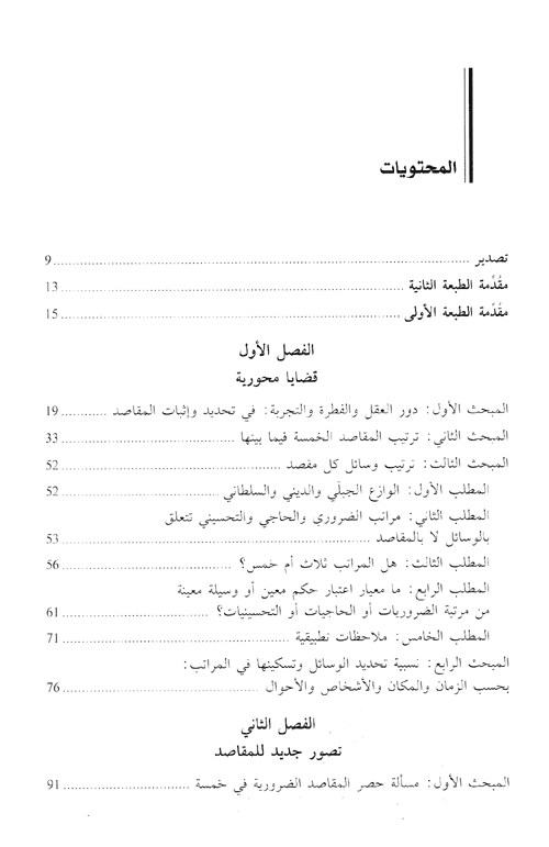 وفي المحور الثاني يقدم تصوراً جديداً للمقاصد يخرج بها من دائرة الضرورات الخمس إلى أربع مجالات: الفرد والأسرة والأمة والإنسانية. يحدد في كل منها عدداً من المقاصد، كما يرتبها إلى درجات بدءاً بمقاصد الخلق والمقاصد العالية إلى المقاصد الكلية والخاصة والجزئية ومقاصد الملكفين.