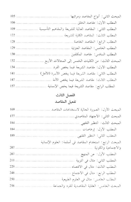 ويركز في المحور الثالث على قضية تفعيل المقاصد، فبعد استعراض الصورة الحالية لاستخدامات المقاصد، يبحث في الاجتهاد المقاصدي، والتنظير الفقهين والعقلية المقاصدية للفرد والجماعة، ويختم بالتساؤل عن مستقبل المقاصد: هل هو علم مستقل أم وسيط أم تطوير لأصول الفقه؟ وقد أضاف المؤلف في هذه الطبعة مبحثاً خاصاً عن استخدام المقاصد في أسلمة العلوم الإنسانية. إقرأ المزيد