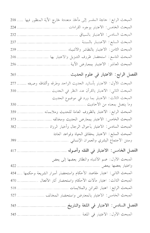 وأما الفصل الخامس فهو الاعتبار في الفقه وأصوله، وتم بيان ذلك من خلال خمسة مباحث وهي: 1-ضم الأشباه والنظائر بعضها إلى بعض واعتبار بعضها ببعض. 2-اعتبار مقاصد الأحكام واستحضار أسرار الشريعة وحكمها. 3-اعتبار مآلات الأحكام واستحضار آثار الأفعال. 4-اعتبار القرائن والملابسات. 5-اعتبار المعارض واستحضار المخالف.