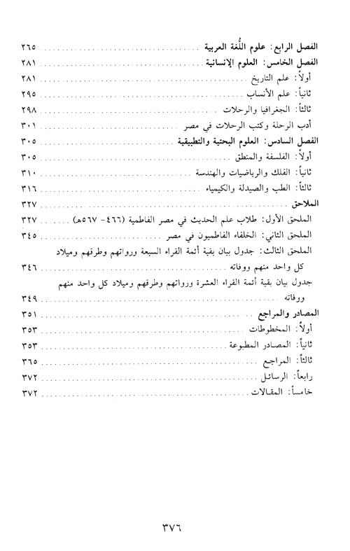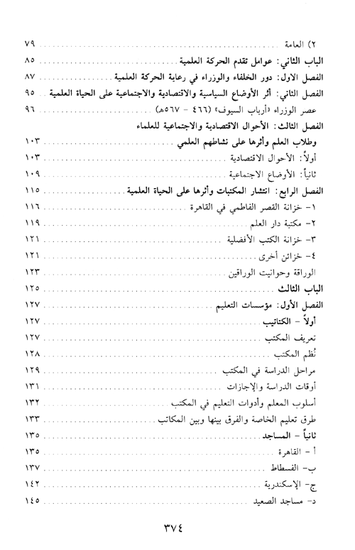 وخصص الباب الثاني لدراسة "عوامل تقدم الحركة العلمية في هذه حقبة". وقسمت هذا الباب إلى أربعة فصول تناول الفصل الأول ...دور الخلفاء والوزراء في رعاية العلم والعلماء وإنشاء المؤسسات التعليمية. أما الفصل الثاني فتناول أثر المتغيرات السياسية والاقتصادية والاجتماعية على توجهات الحركة العلمية وآثارها في تقدم أو تراجع عدد من الميادين العلمية ومحاولة تفسير ذلك. وتناول الفصل الثالث "أحوال العلماء الاقتصادية ومكانتهم الاجتماعية"، أما الفصل الرابع فوصف خزائن الكتب العامة والخاصة في مصر في هذه الحقبة.