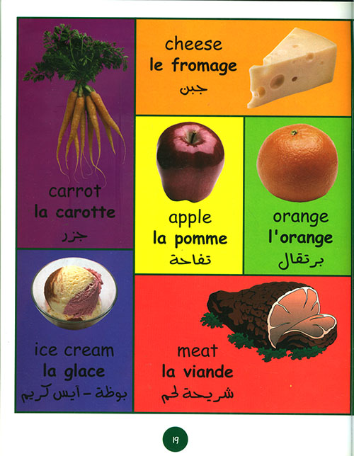 تم تصميم الكتاب لإغناء قاعدة مفردات الطفل بأكثر من 200 كلمة وذلك بأسلوب شيق وممتع، حيث تمثل الصور والألوان أشياء وحالات ملموسة وإلى جانبها الكلمة العربية المناسبة ترافقها معانيها الإنجليزية والفرنسية.