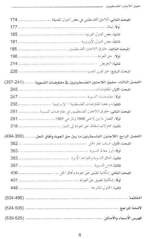 أما النصف الثاني من الكتاب، فيتعلق باللاجئين الفلسطينيين، فهو يناقش كيفية نشوء قضية اللاجئين الفلسطينيين، وحقوقهم في العودة والتعويض، وحق تقير المصير، كما يناقش أوضاعهم القانونية في البلاد المضيفة، عربية وأجنبية، كما يناقش الكتاب نشوء وكالة الغوث "UNRWA" وتقديمها الخدمات لهم.