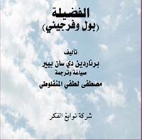 نبذة نيل وفرات:(الفضيلة) أو (بول وفرجيني) هي رواية الكاتب الفرنسي برناردين دي سان بيير، الذي احتل لنفسه لقب (شفالييه)، ولكن الأديب العربي المصري مصطفى لطفي المنفلوطي قام بترجمتها وصياغتها من جديد بلغته العربية الرصينة والساحرة. قدم للرواية الأستاذ محمود خيرت المحامي وتحدث في مقدمتها عن حياة الكاتب الفرنسي برناردين سان بيير ...وصفاته وأفكاره (برناردين كان يرى أن يضع نظاماً جديداً يحارب به قسوة الحياة الحالية وويلاتها) . لقد اعتقد (برناردين أن سعادة الإنسان قائمة على سلوك سبيل الحياة حسبما تتطلبه الطبيعة والفضيلة، وأن الفضيلة العامة مهما بلغ من اتساعها فإن مكانها الأول في نفس كل فرد، ولذلك عدل عن فكرة الجمهورية التي حاول إنشاءها، واقتصر على وصف حياة بعض الأسر المنزوية في ظلال الوحدة التي تتذوق طعم النعيم في حجر الطبيعة وعند بساط الفضيلة ...) . وهكذا ظهرت رواية "بول وفرجيني" التي قال فيها مؤلفها في مقدمته "إني لم أتخيل قصة روائية أصوّر فيها حياة سعيدة تمتعت بها أسرة أوربية في وسط ذلك الفقر، بل يمكنني أن أقول إن أشخاص هذه الرواية قد عاشوا حقيقة في تلك الأصقاع، وتمتعوا بالسعادة التي وصفتها وإن تاريخهم في مجمله صحيح، شهد به كثير من سكان تلك الجزيرة، ولم أضف إليه إلا بعض جزئيات ليست بذات بال" . وبالفعل لقد ظهر تأثير الرواية كبيراً في جميع أنحاء فرنسا، حتى أنها أبكت البعض. يقول المؤلف "أردت عندما وضعت هذه الرواية، أن أعرف مقدار تأثيرها في القراء على اختلاف درجاتهم ومراتبهم، ومشاربهم وميولهم، فتلوتها على بعض السيدات الجميلات المتأنقات فبكين، ثم تلوتها على بعض الشيوخ المحافظين الرزينين فبكوا، فعلمت أني كتبتها للناس جميعاً، وأرضاني هذا الحكم الصامت كل الرضا".