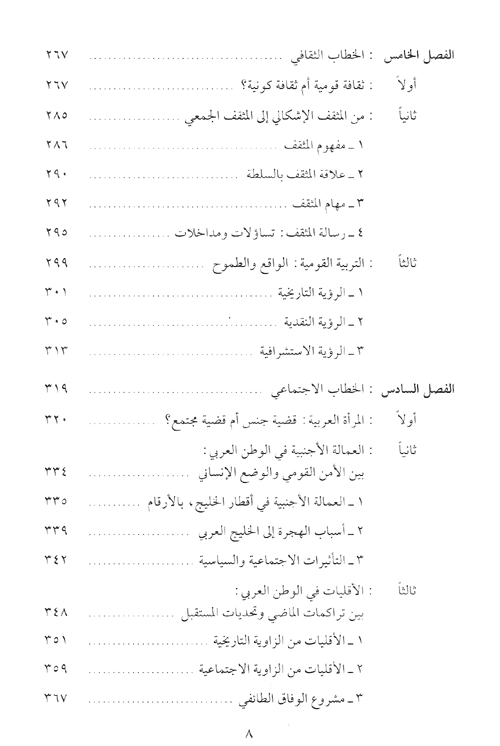 نبذة الناشر:شاء الباحث طاهر المنّاعي أن يختار الخطاب القومي العربي المعاصر من خلال أبحاث مركز دراسات الوحدة العربية، موضوعاً لنيل درجة الدكتوراه، بدافع ذاتي قومي، أولاً، وبدافع علمي، يجد ما يبّرره في الثقافة العربية نفسها؛ فالفكر القومي جزء من النشاط الفكري العام في الوطن العربي، ومن أقدم تجليّاته.