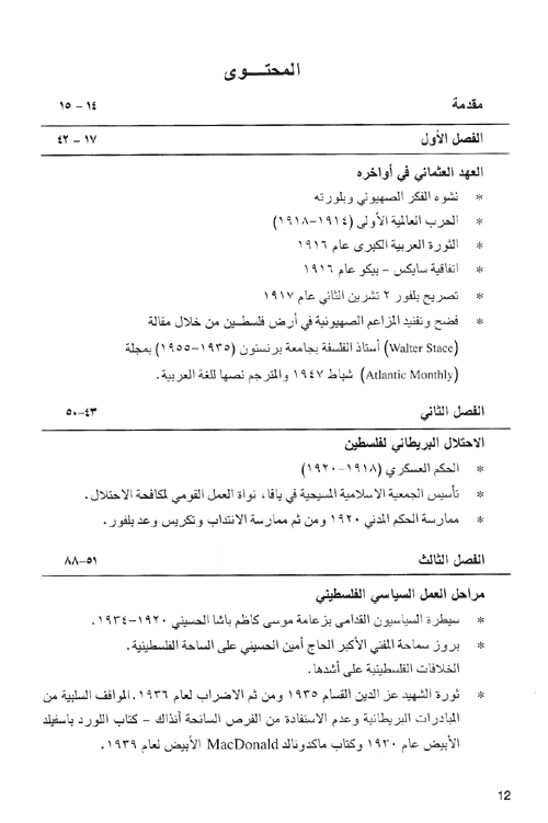 نبذة الناشر:يتعرض الكاتب للأبعاد المرسومة بستة فصول أولها العهد العثماني في أواخره وثانيها الإحتلال البريطاني لفلسطين وثالثها مراحل العمل السياسي الفلسطيني ورابعها الجامعة العربية وفلسطين وخامسها فترة ما بين انتهاء الحرب العالمية الثانية وقرار التقسيم وسادسها رؤية مستقبلية.