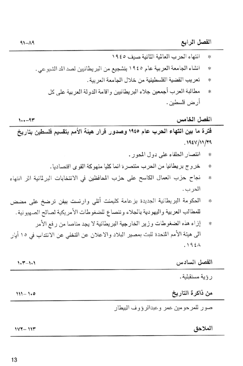 ويميز المؤلف بين موقف حكومة العمال في بريطانيا التي كانت "أرحم" على العرب من حكومة المحافظين ويلفت النظر بخصوص الأمم المتحدة بأن العرب يعملون لها أهمية لا تستحقها فقراراتها وتوصياتها عاجزة كلياً عن حل أي صراع قومي أو مصيري، بل إن حسم كل صراع يتوقف أولاً وأخيراً على مدى ما يملكه الطرف الراغب في الحسم من إرادة وعزم وتنظيم.