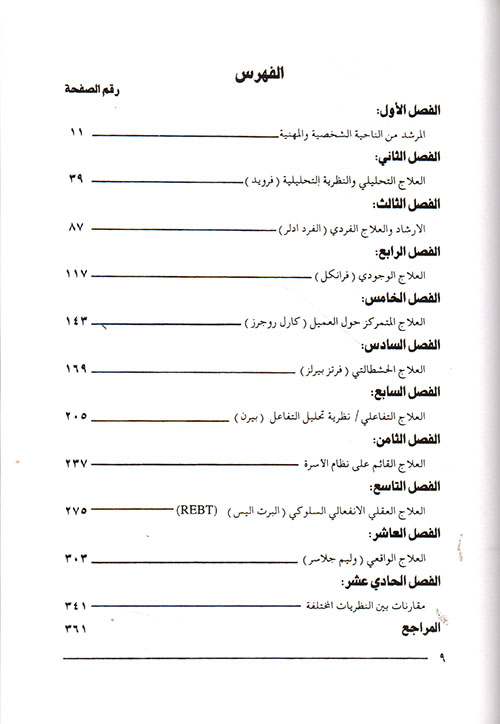 الكتاب يتألف من إحدى عشر فصلاً، ...ركزت في الفصل الأول على النواحي الشخصية والمهنية والأخلاقية للمرشد أوالمعالج، أما الفصل الثاني فقد تناولت خلاله العلاج التحليلي لفرويد أما الفصل الثالث فقد تناولت خلاله الإرشاد والعلاج الفردي لـ إدلر، ثم الفصل الرابع (العلاج الوجودي)(فرانكل)، ثم الفصل الخامس: العلاج المتمركز حول العميل (كارل روجرز)، ثم العلاج الجشطالتي لـ فرتيز بيرلز، ثم الفصل السابع نظرية تحليل التفاعل (بيرن)، ثم الفصل الثامن العلاج القائم على نظام الأسرة، وهذا منحنى لم يتعمق فيه الأدب النفسي العربي، وخلاله حاولت جهدي أن أركز على دور المرشد والمعالج للتفاعل مع الأسرة لكونها البنية الأساسية في المجتمع.