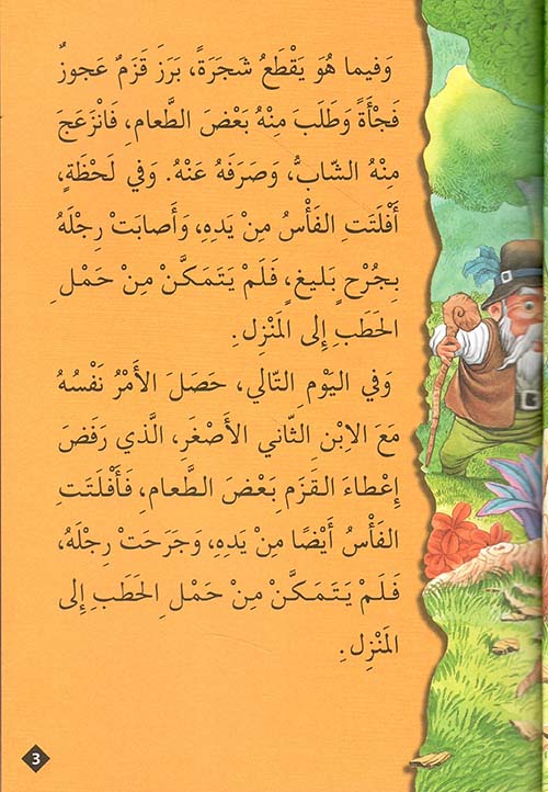 ذات يوم خرج الابن لأكبر لإحضار الحطب فقابل قزم عجوز طلب منه بعض الطعام فلم يقبل فأفلتت الكأس من يده ولم يحمل الحطب ...وهذا ما حصل للأبن الثاني.