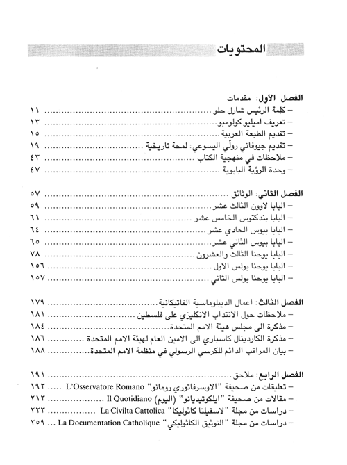 نبذة نيل وفرات:هذه الوثائق، من عهد بنديكتوس الخامس عشر وليون الثالث عشر الى ايام يوحنا بولس الثاني، تعطي فكرة شاملة عن موقف الكرسي الرسولي الثابت من القدس والأراضي المقدسة، وتقدم لتخطي الأنانية وتشكل خطوة أولى على طريق السلام.