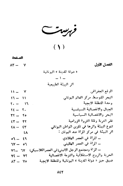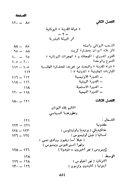 وفي هذا المجلد الذي يتألف من قسمين يتناول المؤلف بإسهاب التاريخ اليوناني (العصر الهللادي) حيث يعرض في القسم الأول نشأة دولة المدينة اليونانية وأثر البيئة الطبيعية كالموقع الجغرافي والجبال والبحر على ذلك كما يبحث هذا القسم بتنوع البيئة وأثرها في تكوين المواطن اليوناني وأثر البيئة في مركز المرأة عند اليونان، ثم يعرض لأثر البيئة البشرية وتأثر بلاد اليونان بحضارة كريت وأقاليم بلاد اليونان وتطورها السياسي (مقدوينا-ايبيروس-أكارنانيا-طيبه- البلوبونيز-أرجوس).
