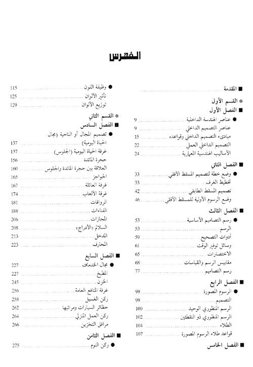 نبذة نيل وفرات:تنبع ريادة هذا العمل من كونه منهلاً للمبادئ الأساسية للتصميم الداخلي التي لا غنى عنها لكل من يحب هذا الفن الرفيع ومن تمكن ناحيته، وغناه بالأمثلة العديدة والواضحة لكل حالة أو ناحية تعطيه صفة الكتاب الشمولي المختصر في هذا العلم بالذات. وتجزئة العمل إلى كتابين كان من أجل سهولة ...تناوله، فاحتوى الكتاب الأول على النواحي النظرية في المبادئ الأساسية للتصميم الداخلي، والمشاريع الألوان على حد سواء، مروراً بالنواحي العملية لاختيار السطوح والأرضيات والمفروشات، بعد أن تناول بالتفصيل الحياة اليومية بما فيها المعيشة والعائلة وغرفة المائدة ثم انتقل إلى غرفة الألعاب والرواقات والفناءات والأدراج ومدخل المنزل الرئيسي وأنواعه، ويتمم ذلك في مجال الخدمات التي يدخل المطبخ من متطلباتها الرئيسية، وما يحويه من خدمات ملحقة، مروراً بمرآب السيارة ومرافق التخزين وأخيراً ركن النوم والحياة الليليلة.