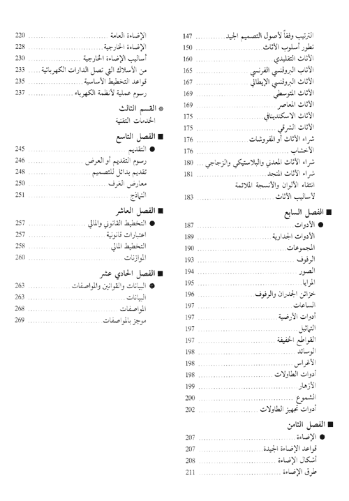 أما القسم الثاني فاحتوى على الأدوات الداخلة في تركيبة المنزل كالموقد والبرادات والغسالات وأدوات تنقية المياه... ومن ثم الأثاث وطائفة ووظائفه وترتيبه وفقاً للطرز والحقب، ومن ثم انتقل إلى الأدوات المساعدة في عملية التزيين كالخزائن الجدارية والرفوف... أما الكتاب الثاني فاختص بالنواحي العملية والتطبيقية. إقرأ المزيد