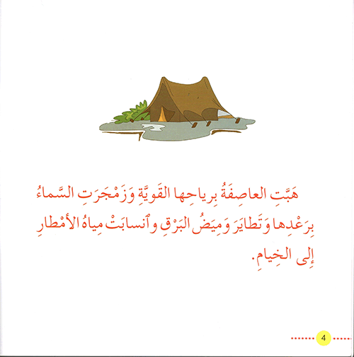 نقرأ عناوين هذه السلسلة: الزرافة الخرساء، العصفوران وعدوهما البوم، موعد عودتنا، النهر العائد إلى موطنه، حديث مع الشمس، بذرة التفاح، بذرة الزيتون، شجيرة اللبلاب المغرورة، القطط الثلاث، القرد الطماع، الغزالات الثلاث والقرود، الثعالب تتصافح.نبذة الناشر:هَبَّتِ العاصفَةُ بِرياحِها القَويَّةِ وَزَمْجَرَتِ السماءُ بِرَعْدِها وَتَطايَرَ وَمِيَض البَرْقِ وان سابَتْ مِياهُ الأمْطارِ إِلى الخِيامِ.كانَ الأطْفالُ يَرْتَجِفُونَ مِنْ شدَّةِ الْبَرْدِ رُغْمَ أنَّ كُلاًّ مِنْهُمْ يَلْتَوِي حَوْلَ نَفْسهِ في جلْسةِ قُرْفُصاءٍ ويَتَدَثَّرُ بِدِثارٍ سمِيكٍ، فقدْ أبَلَتِ السنواتُ العَشرُ تِلْكَ الخِيامَ ومَزَّقَتْها، حَتَّى أمَستْ غَيْرَ قادِرَةٍ على رَدِّ المَطَرِ وَمَنْعِ الْبَرْدِ.ماذا كانت ردة فعل إياد ؟ إقرأ المزيد