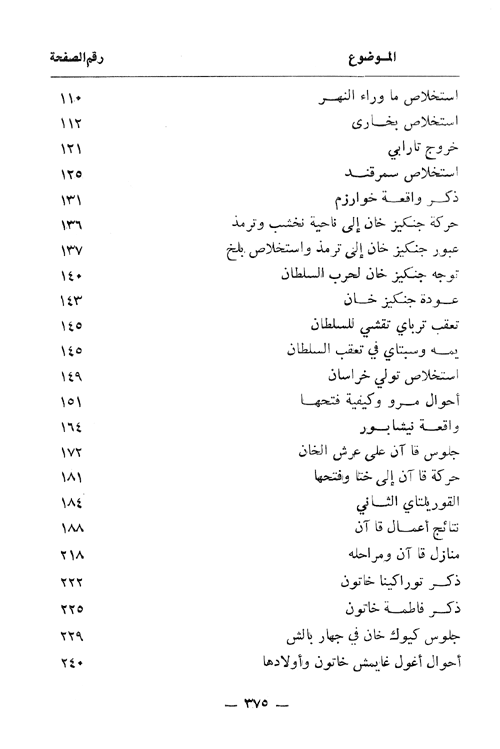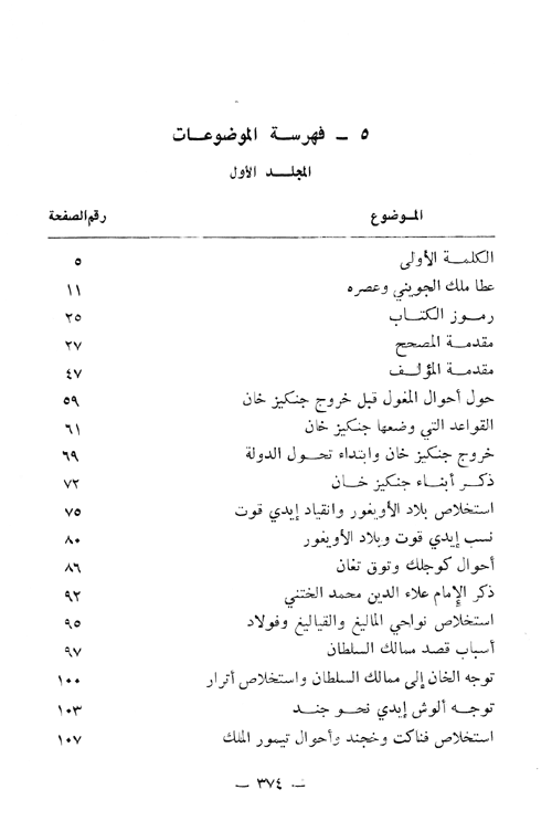 وبشكل عام يتألف الكتاب من ثلاثة أجزاء، ضم الأول مقدمة طويلة عن عادات المغول ورسومهم القديمة والقوانين التي وضعها جنكيز خان، وفتوحاته في ممالك الأويغور. وفصلاً عن تاريخ أقوام الأويغور وعاداتهم ومعتقداتهم ورسومهم تعد في غاية الأهمية. ثم يفصل في فتوحات جنكيز خان وغزو جيوشه في ما وراء النهر وإيران، وما سببوه من قتل ونهب وتخريب، وإحاطة بالحكومة الخوارزمشاهية. ويستمر في الحديث حتى وفاة جنكيز خان 624 وسلطنة أوكتاي قا آن بن حتميز خان (626-639)، ومرحلة نيابة سلطنة "توراكينا خاتون" أم كيوك خان (639-643)، وسلطنة كيوك خان بن أوكتاي قا آن (643-644)، ويعقب ذلك فصل في غاية الاختصار عن تاريخ توشي (جوجي) وجغتاي ابني جنكيز خان.