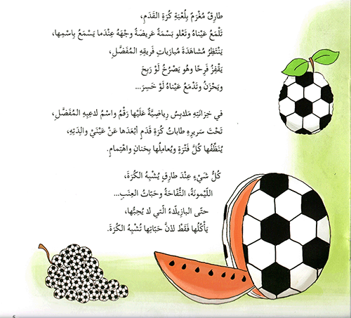 نصّ يصف شغف طارق ...بلعبة كرة القدم في نصّ لا يخلو من الخيال والطّرافة. من خلال النّصّ هناك تركيز على ضرورة تشجيع الطّفل على ممارسة هوايته المفضّلة واحترام خياره وشغفه برياضة أو بهواية معيّنة وإعطائه الفرصة لممارستها وإشباع حبّه لها. التّعلّق بهواية لا يتعارض با لضّرورة مع تحصيل الطّفل العلميّ ونجاحه في المدرسة، بل على العكس، إذا تمّ ذلك باعتدال قد يساعده في اكتساب صفات تنمّي شخصيّته وتساعد في بنائها.