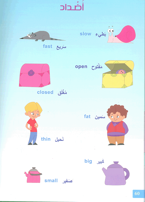 وفي هذا المعجم يتعرف الطفل هذه المفردات ضمن عالم بهيج من الصور والألوان ويجدها مصنفة ضمن موضوعات.