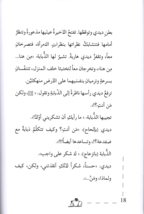 نبذة الناشر:والد "ديدي" زعيم الضفادع، تسود قريته تقليد متوارث في اختيار الابن الأكبر للزعيم، زعيماً جديداً للضفادع، بغض النظر إن كان ضفدعاً ذكراً أو ضفدعة أنثى. على هذا الابن الأكبر أو البنت الكبرى أن يتبع أول ذبابة يراها واسمها "ذبابة الحظ" وذلك بعد سباتهم في فصل الشتاء. ترى كيف خاضت "ديدي" ...رحلتها ومغامرتها؟ وهل أكلت "ذبابة الحظ"؟ هل توّجت زعيمة على الضفادع؟ ماذا حدث معها؟ إقرأ المزيد