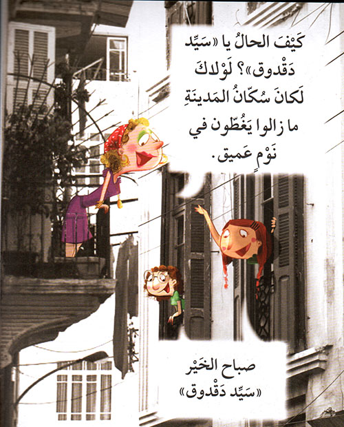 نبذة الناشر:بدأت هذه القصّة قبل اختراع الساعة والهاتف والمنبّه، بطلها السيِّد "دقدوق" الذي يحمل عصاه ويوقظ سكّان المدينة وهو ينادي: "يا نايم صَحْصِح من النوم، سيِّد "دقدوق" أتاك اليوم". ولكن مع مرور السنوات، تغيّرت المدينة إلى أن أصبحت ذات مبانٍ عالية وشامخة، ما أحزن السيِّد "دقدوق". تُرى ماذا سيفعل السيِّد "دقدوق" ...ليوقظ الناس من جديد؟ إقرأ المزيد