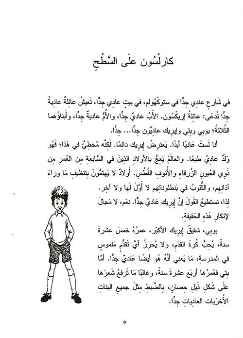 "... ألقَى كارلْسُون نَظرةً خاطِفةً علَى إيريِك، وتابَع إِبحارَهُ في الهَواءِ، دارَ ...فوقَ سَطحِ البناءِ المُقابِلِ، لفَّ حولَ المدخَنةِ، ثُمَّ قادَ طريقَةُ عائداً إلى نافذة إيريك.