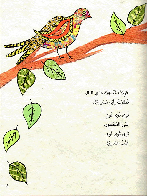 لا يا نورة. / لا تزعجي العصفورة. / لا يا نورة. / لا تخيفي العصفورة. / أتركيها تغني، / أتركيها تطير. / أتركيها تعود إلى عش العصافير / فهي ظريفة، صوتها جميل. / أتركيها تغني. / أتركيها تطير. / أتركيها تعودُ إلى عش العصافير".