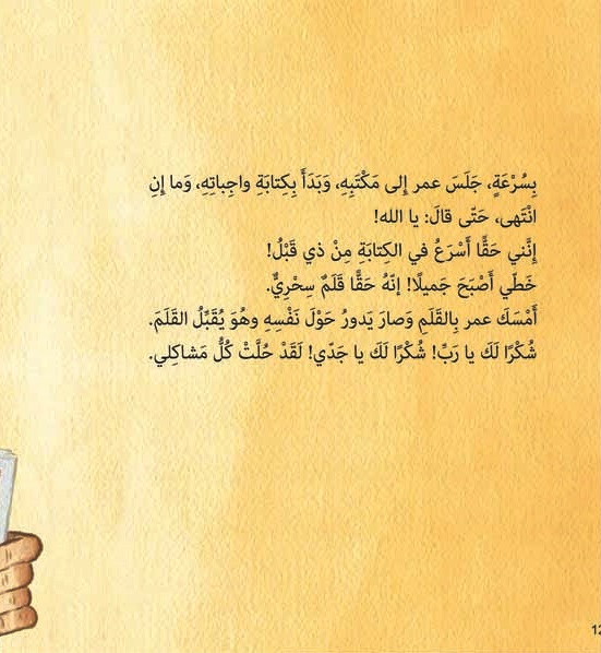 نبذة الناشر:عمر مقتنع أن خطه رديء ولا يمكن أنْ يتحسّن، لكنّه في أحد الأيام يعثر على قلم سحري، يساعده أنْ يكتب بسرعة وبخطٍ جميل.ما هو السر في تحسن خط عمر؟ هل السبب في ذلك هو فعلًا القلم السحري؟.