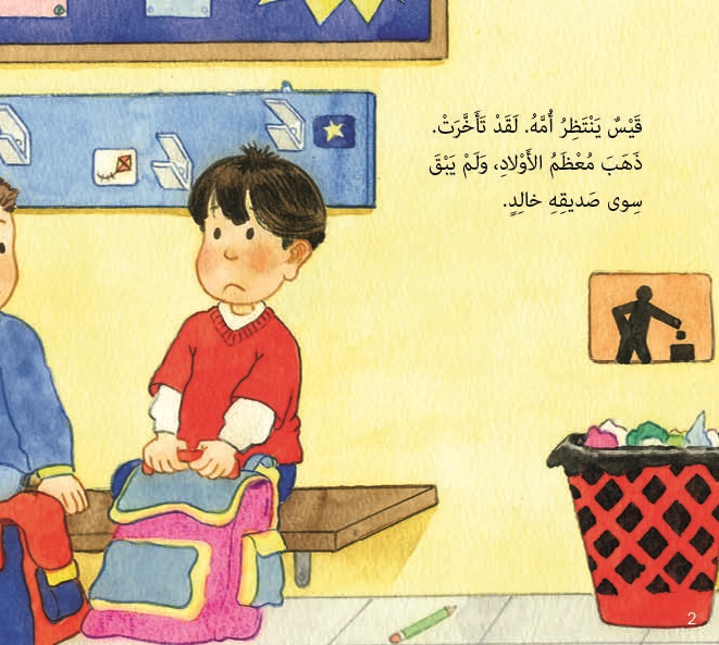 نبذة الناشر:ينهي قيس يومه الدراسيّ، لكنْ يبقى عليه انتظار قدوم أمّه لتصطحبه إلى البيت، تتأخر أمه في المجيء فتنتابه مشاعر الخوف والقلق. تأتي معلمته لتطمينه، لكنه لا يشعر بالاطمئنان إلاّ عند وصول أمه. هذه القصة مميزة بأسلوبها ولغتها وتقنياتها، وهي تعالج قلق الأطفال عند عدم تواجد الأهل؛ لأسباب خارج إرادتهم بسبب ...أحداث قد تكون غير متوقعة. إقرأ المزيد