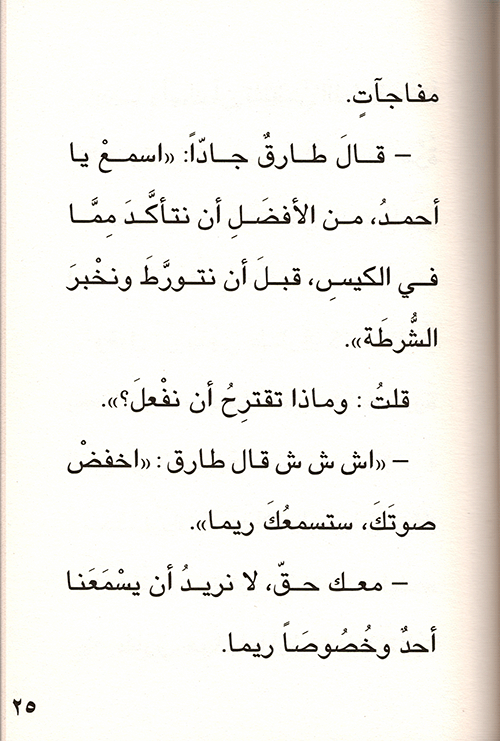 نبذة الناشر:"يرى أحمد جارته تجرّ كيسًا ثقيلًا في وضح النهار وتتلفت حولها، لذلك يعمل بجد لاكتشاف ما كانت تخفيه فيه. يحاول أحمد التسلل إلى منزلها بمساعدة صديقه طارق وشقيقته ريما، لكن في كل مرة كانوا يحاولون فيها، ينتهي الأمر بهم إلى الفشل.