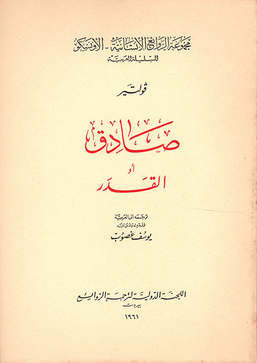 وقصة "صادق" أو "القدر" التي نقدم لنصها باللغة الفرنسية ولترجمتها للعربية في هذا الكتاب، هي من قصص فولتير الأولى، نشرت أولاً في أمستردام سنة 1747 بعنوان "ممنون". تجري حوادث هذه القصة في بلاد شرقية (بابل)، بطلها فتى غني تحلى بالأخلاق الكريمة والسجايا الحميدة وأصالة الرأي والأدب والعدل والإنصاف. ما كان همه إلا أن يعيش سعيداً كافياً الناس خيره وشره لكن القدر الذي كتب له منذ الأبد قد جرّه إلى مغامرات ومخاطرات لم تكن في حسبانه فأحب حباً كان أصل بلائه فاضطر إلى الهرب والقتل، وبيع رقيقاً فعانى العبودية ثم ظهر فضله في حل بعض القضايا فرفع إلى أعلى المراتب. وما زال يتقلب من حال إلى حال حتى عاد إلى بابل وتزوج بالملكة التي أحبها وأحبته ونادى به البابليون ملكاً عليهم.