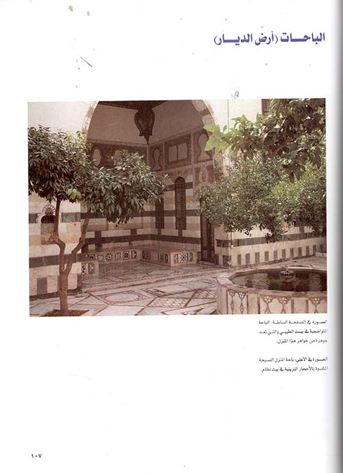 يقدم نص هذا الكتاب أول الأمر الخلفية التاريخية فيصف تطور مدينة دمشق وأيامها الطيبة عبر العصور، ثم ينتقل بعدها ليقدم وصفاً لفن العمارة في تلك المدينة وأسلوب الحياة فيها، ثم يختتم صفحاته بتقديم وصف للبيوت الدمشقية والناس الذين شيدوها وعاشوا فيها.