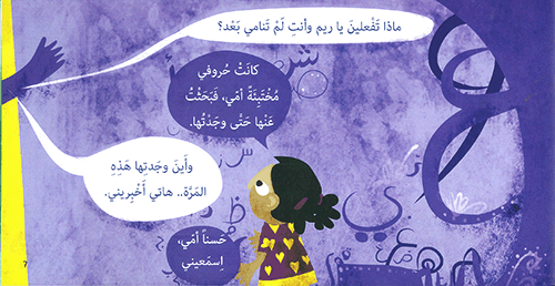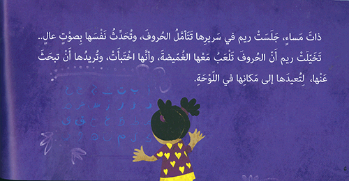 نبذة الناشر:هذا الكتاب ليس كتاباً تعليمياً مباشراً، أو مادةً دراسيةً، هو رحلة بحث تقوم بها "ريم"، البنت العاشقة للغة العربيّة، تتنقل فيها بين حروفها وكلماتها، تساعدها مخيلتها الواسعة، وحبها الشديد للوحة الحروف الأبجدية المعلّقة في غرفتها، منذ أن كانت صغيرة.