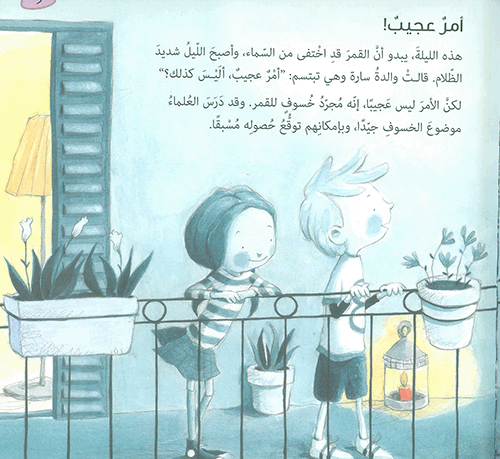 تخبرهما والدتهما بأنّ هذا الأمر طبيعيّ، فهذه ظاهرة علميّة تسمّى خسوف القمر، كما تشرح لهما كيف يتغيّر شكل القمر.