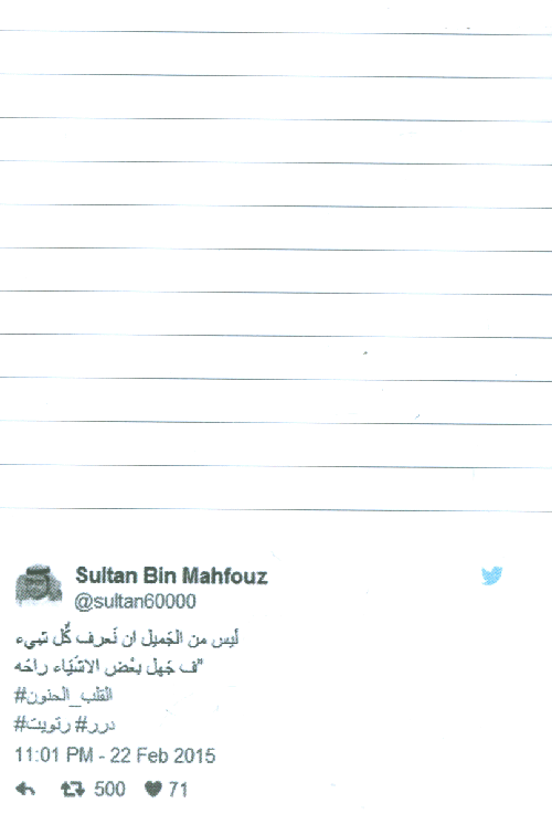 نبذة الناشر:"تغريدات خليجية" كراس لتدوين الملاحظات والخواطر، تزيّنه أقوال لشخصيات عربية معروفة، ويمكن وضعه بسهولة في الجيب للاستخدام عند الحاجة.