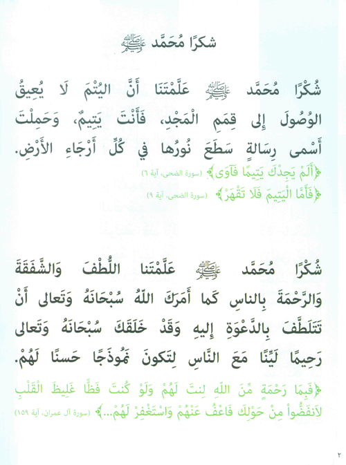 "شكراً محمد صلى الله عليه وسلم" كتاب ديني يتضمن آيات قرآنية عن النبي محمد صلى الله عليه وسلم، وهو كتاب مُوَجَّه إلى الصِّغَارِ الَذينَ لاَ يَعْلمونَ مَا هُوَ فَضْلُ مُحَمَّدٍ صلى الله عليه وسلم عَلَيْنَا، وَهُوَ ...مَرْجَعٌ لَهُمْ حِينَ يَكْبُرونَ وَيَقْرَأُونَ شُكْرَهُم لِهَذا الشَّخْصِ الَذي لَمْ يُوْلَدْ مِثْلُهُ في الْكَونِ، فَأَرَادَهُ اللهُ عَزَّ وَجَلَّ أنْ يَكُونَ خَاتِمَ الأَنْبِيَاء.