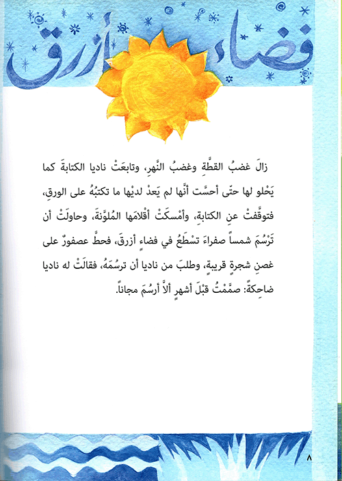 نبذة الناشر:كتاب يحكي عن بنت اسمها ناديا، تجلس في حديقتها لترسم وتكتب حوارات تجري بين القطة والنهر، وبين العشب والقطة، والتراب والشجرة، الشمس والسحابة، وغيرها.. إلى أن تهب الريح عنيفة... نص غني بأسلوب زكريا تامر السهل الممتنع.