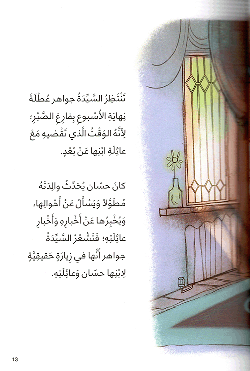 نبذة الناشر:تحاول السّيّدة جواهر أن تتفاعل مع حفيدها الوحيد، منصور، بكلّ الطّرق، وذلك عن طريق الإنترنت؛ لأنّ عائلة ابنها تعيش في بلاد بعيدة من أجل العمل. وبالرّغم من محاولاتها، فإنّ منصور منشغل عنها دائمًا بألعابه وبأموره الخاصّة ولا يلتفت إليها كثيراً. تحدث مفاجأة تقلب ميزان الأمور، فيتغير الوضع تمامًا، وتنموعلاقة حميمة ...بين السّيّدة جواهر وحفيدها منصور. قصّة طريفة وممتعة، قد تكون قصّة الكثير من الجدّات الّلاتي يعشن بعيداً عن أحفادهنّ. إقرأ المزيد
