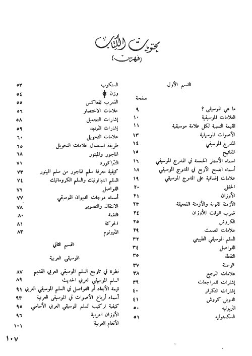 أما في قسمه الثاني فيشرح قيمة الأبعاد أو الفواصل في السلم الموسيقي العربي، أسماء أرباع الأصوات في الموسيقى العربية، كيفية تركيب السلم الموسيقي العربي الأساسي، الأوزان العربي، الأنعام العربية.