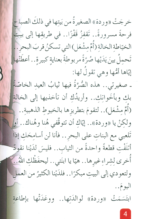 نبذة نيل وفرات:خرجَتْ "وردة" الصغيرةُ من بَيتِها في ذلكَ الصباحِ فرحةً مسرورةً... تَقفِزُ قَفْزاً... في طريقِها إلى بيتِ الخيّاطةِ الخالةِ (أُمِّ مِشْعَل) التي تسكنُ قربَ البحرِ...