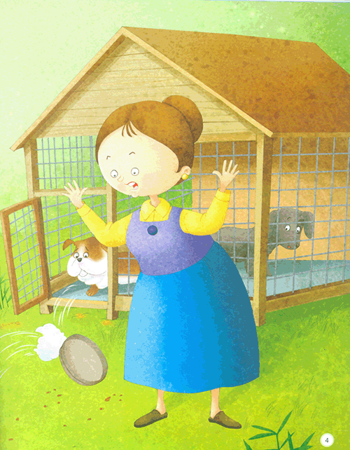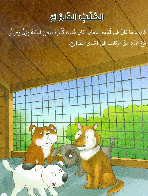 وكُلَّما كانَتْ عَلْياءُ، زَوْجَةُ صاحِبِ المَزْرَعَةِ، تُحَضِّرُ الطَّعامَ لِتُوَزِّعَهُ عَلى الكِلابِ، كانَ بَرْقٌ الطَّمَاعُ يَنْتِشُ الطَّعامَ مِنْ يَدِها ويَفِرُّ بِهِ هارِباً.