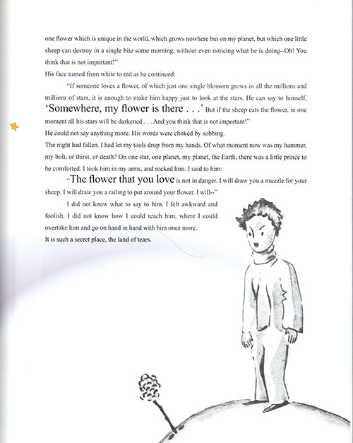 نبذة الناشر:The little prince lives on a little asteroid, B612, which he shares with a vain flower and three volcanoes. From there he sets off on a voyage among the planets and “falls” to Earth, where he strikes up a close friendship with an aviator. The little prince discovers that, separated ...from the things that gave meaning to his daily life, that needed his care and provided his well-being, he feels more alone than ever. His conversations with the king who has no subjects, with the drunkard who drinks to escape the embarrassment of being a drunkard, etc., who the little prince that it is not worth living in isolation; it is ridiculous and useless. Later, his chats with the fox teach him that whoever forms a relationship is forever responsible for what he has created. Thus, having learned this lesson, and feeling overwhelmed by melancholy, the little prince decides to return home and he leaves us the possibility of sensing his presence each night in the starry sky.