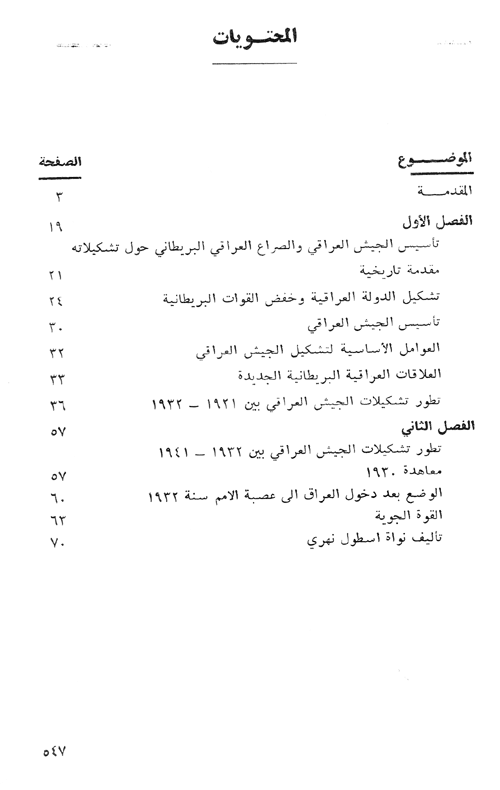 ولتحيط الباحثة بكافة جوانب دراستها فقد عمدت إلى تقسيمها على خمسة فصول: بحثت في أولها موضوع تأسيس الجيش العراقي ومبررات تأسيسه ثم تطرقت إلى موقف بريطانيا في إعاقة توسيع الجيش، عندما وجهت جهودها نحو تحقيق الموازنة بين بناء الجيش العراقي وتأمين ولائه للنظام، وعدم تهديده مصالح بريطانيا في العراق، ولذلك فرضت بريطانيا إشرافها على الجيش العراقي ووقفت ضد فكرة التجنيد الإجباري وبذلت جهوداً واسعة للحصول على سلطات إجرائية للبعثة العسكرية البريطانية للسيطرة على الجيش العراقي الذي اتجه إلى مناهضة بريطانيا، وبخاصة الكتلة القومية التي أوضحت مبادئها في الميثاق القومي سنة 1927 والذي كان أهم بنوده القضاء تدريجياً على نفوذ الإنكليز في الجيش، ولذلك وبسبب توقع اكتشاف النفط استمرت بريطانيا على موقفها المعارض للتجنيد الإجباري ولم تغير من واقع الإشراف البريطاني على الجيش العراقي شيئاً وقد استمرت هذه الحال إلى سنة 192 حين دخل العراق عصبة الأمم.