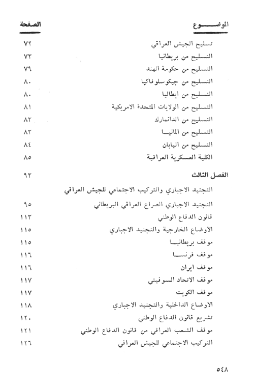 أما الفصل الثالث فقد خصصته لدراسة "التجنيد الإجباري والتركيب الاجتماعي للجيش العراقي باعتباره شكلاً من أشكال الصراع العراقي البريطاني". فبحثت في التجنيد وكيف ابتدأ على أساس التطوع الذي لم يرض الحكومة العراقية التي كانت ترغب في أن يكون التجنيد إلزامياً، ووضحت موقف بريطانيا المعارض لإصدار قانون الدفاع الوطني وتأثيرها على موقف جيران العراق، ثم بينت موقف كل من بريطانيا، وفرنسا، وجيرانها والاتحاد السوفيتي من الحكومة العراقية عند إصدارها قانون الدفاع الوطني. كما بينت موقف الشعب العراقي من التجنيد ثم بحثت في هذا الفصل التركيب الاجتماعي للجيش العراقي ضباطاً وجنوداً من الناحية القومية والدينية والحضارية على قدر المعلومات المتوفرة.