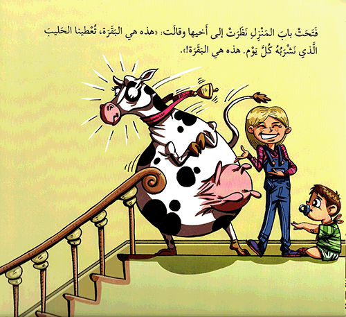 نبذة الناشر:تتحدَّث هذه القصّة عن فتاةٍ تحاول أن تشرح لأخيها الصغير عن البقرة، لكنَّه لا يفهم ما تقول. فجأة، جاءتها فكرة غريبة، فجلبت بقرة إلى البيت وأصعدتها السلالم ليراها أخوها. تمكَّنت البقرة من صعود السلالم تُرى هل ستتمكَّن من نزولها؟ وكيف؟