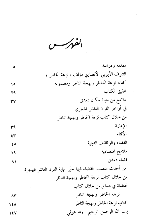 نبذة نيل وفرات:نزهة الخاطر وبهجة الناظر، موضوعه تراجم القضاة وتاريخ القضاء في دمشق في عشرة قرون من الزمن، ويعكس هذا الاهتمام شغف العلامة شرف الدين بن يوسف الأنصاري بكتب التراجم والتواريخ، وهو في عمله هذا اعتمد على سلسلة من الكتب الموثوقة في موضوعه. وقد وصف الحوادث المتعلقة بشؤون القضاء وصفاً جيداً، ...كما لم يغفل الحديث عنت الهيكل العامل للدولة. وهو إذ يسرد تاريخ أعيان دمشق ودورهم في الحياة الاجتماعية يعطي صورة واضحة عن طبيعة المجتمع الدمشقي الذي كان هؤلاء جزءاً منه.