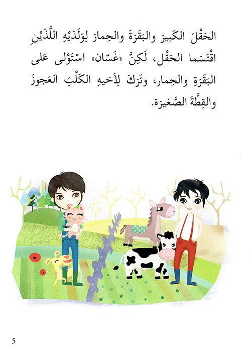 نبذة الناشر:في قديم الزمان عاش فى قرية صغيرة الأخوان دهشان وحسان ، كان حسان قنوعاً مطيعاً لوالده الشيخ حمدان يعاونه فى زراعة الحقل الكبير بكل جد و إتقان ، يرعى البقرة و الحمار فيهتم بطعامهما و نظافتهما و بعد إنتهاء عمله كان يعود للمنزل يعتنى بالكلب الذى كبر ولم ...يعد قادراً على الجرى و القطة الصغيرة التى وجدها فى إحدى ليالى الشتاء ترتجف من البرد فعطف عليها و حملها للمنزل لتعيش معهم و بفضلها صار الحقل خالياً من الفئران ، اما دهشان فكان على العكس طماعاً كسولاً يتهرب من العمل و يحلم ان يصبح غنياً من دون جهد او تعب .. مرت الأيام والأعوام و رحل الشيخ حمدان و ترك الحقل الكبير و البقرة والحمار لولديه دهشان وحسان.. كيف سيقتسمان ما تركه لهما والدهما؟ وماذا سيحصل معهما؟ .. إقرأ المزيد
