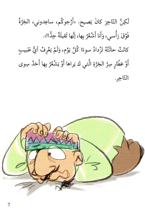 نبذة الناشر:تدور أحداث هذه القصّة عن تاجرٍ غنيٍّ، ولكنَّه بخيل لا يساعد الفقراء ولا المحتاجين. استيقظ ذات يومٍ وشعر بشيءٍ ثقيلٍ فوق رأسه. فراح يصيح: “النجدة، جرّة كبيرة فوق رأسي”… إلى أن جاء أهال الحيّ، فلم يجدوا شيئًا. ولكن، هناك طبيبٌ خلّص ذلك التاجر من تلك الجرّة الثيقلة… تُرى ماذا فعل ...هذا الطبيب؟ وهل فعلاً كانت الجرّة فوق رأسه أم ماذا؟ إقرأ المزيد