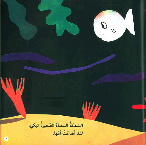 نبذة الناشر:"السّمكةُ البيضاءُ الصّغيرةُ" قصةً طريفةً ومسلّيةً، صيغت بأسلوب طفولي مُحَبِّب، تساعد الأطفال على التعرف إلى عالم البحار يرافقون خلالها السّمكةُ البيضاءُ الصّغيرةُ التي أضاعت أمها في البحر وكلما توفقت هذه "السمكة الصغيرة" أمام كائنٍّ بحري وظنتهُ أمها؛ سيتعرف أطفالنا إلى حيوانات البحر الجميلة والملونة، فهذا هو "السلطعونُ"، وهو أحمر اللون، ...وهذه هيَ "نجمة البحر" وهيَ برتقالية اللّونِ، وهذه هي "الحلزونة" وهيَ صفراء اللون، وتلك هي "السلحفاة" وهيَ خضراء اللّونِ، وهذا هو "الحوت" وهو أزرق اللّونِ، وذاك هو "الأخطبوط" وهو بنفسجي اللّونِ.