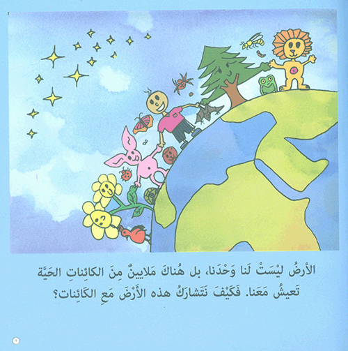 ولهذا الغرض تُخبر مادة الكتاب الأولاد بأننا لسنا وحدنا على هذه الأرض، بل أن هناك ملايين من الكائنات الحيَّة التي تعيش معنا. فتفسر لهم كيف نتشارك هذه الأرض مع الكائنات الأخرى بكل متعة ومحبة.
