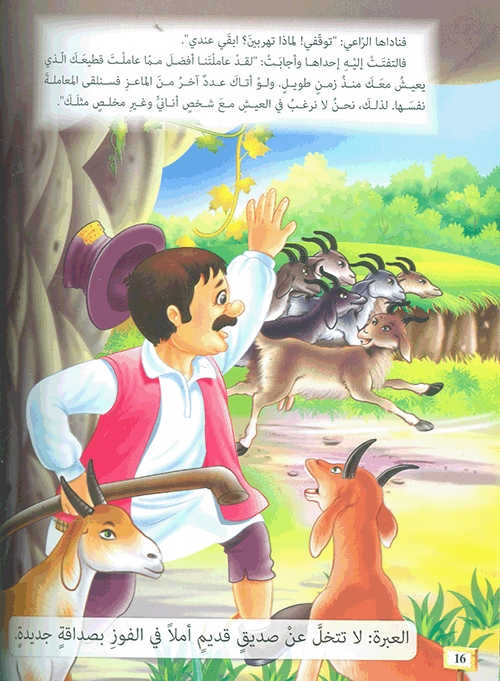 الكتاب الثالث: "قصصٌ وعبرٌ مشهورة" ويضم: 1- الدّيكُ الذّكيُّ، 2- العنزةُ الحمقاءُ، 3- حزمةُ الحطبِ، 4- الرّاعي والماعزُ البرّيّةُ.