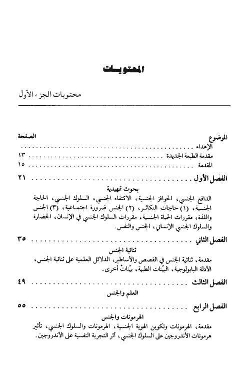 في الجزء الأول من هذا الكتاب تطرقنا إلى مواضيع مهمة تتحدث عن الجنس والنفس في الحياة الإنسانية فعرضنا لما يلي من الموضوعات ثنائية الجنس، العلم والجنس، الهرمونات والجنس، الحياة الجنسية للأطفال، الجنس في مراحل العمر، الجنس والزواج، الحياة الجنسية للأنثى، البرودة الجنسية عند الأنثى، الاستجابات الجنسية، الاستنماء، القوة الجنسية، الضعف الجنسي، العطل الجنسي، الاغراقات الجنسية، الجنس والحياة، الألم والجنس، السحاقية، المرمات الجنسية، العقاقير والجنس، علاج الاضطرابات الجنسية، الفن والجنس، الجنس والإبداع، الفروق بين الذكر والأنثى، ومواقفهما من الأمور الجنسية، الحب والجنس، الجاذبية والجنس.